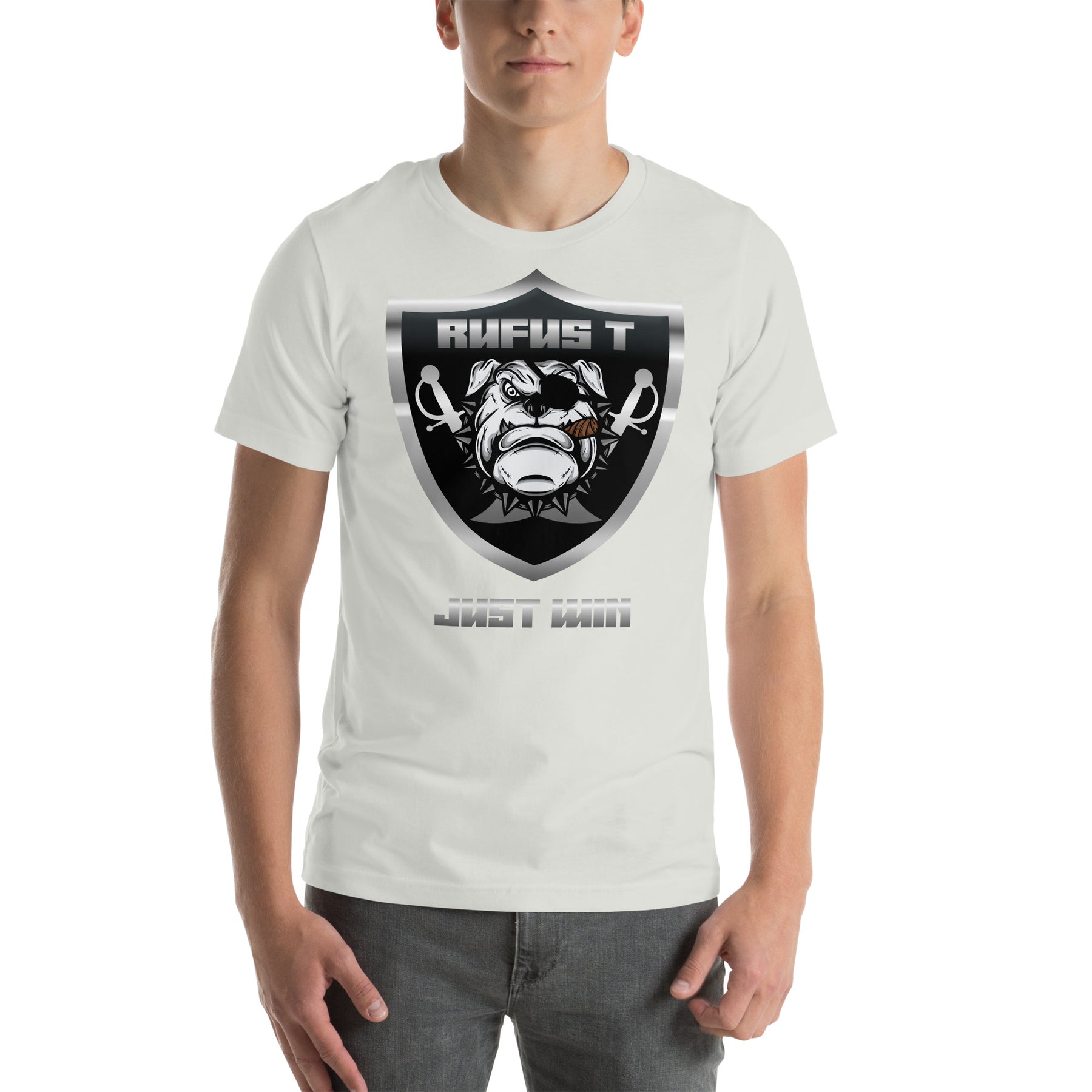 Show your allegiance to Rufus T.'s relentless pursuit with the Rufus T. - Just Win Raiders Tribute Unisex T-Shirt. This striking design transforms the classic Raiders shield into a tribute, featuring Rufus T. - a battle-hardened bulldog with an eyepatch and cigar - set against silver and black, flanked by crossed swords and crowned with the motto "Just Win." Reflecting his journey from disgraced colonel to vengeful icon, this T-Shirt ties into the Blazing Bulldogs' unfolding saga. Made from soft, breathable 100% cotton, it offers a classic fit ideal for any challenge. Wear it proud and let the world know you back a winner. Free shipping included!